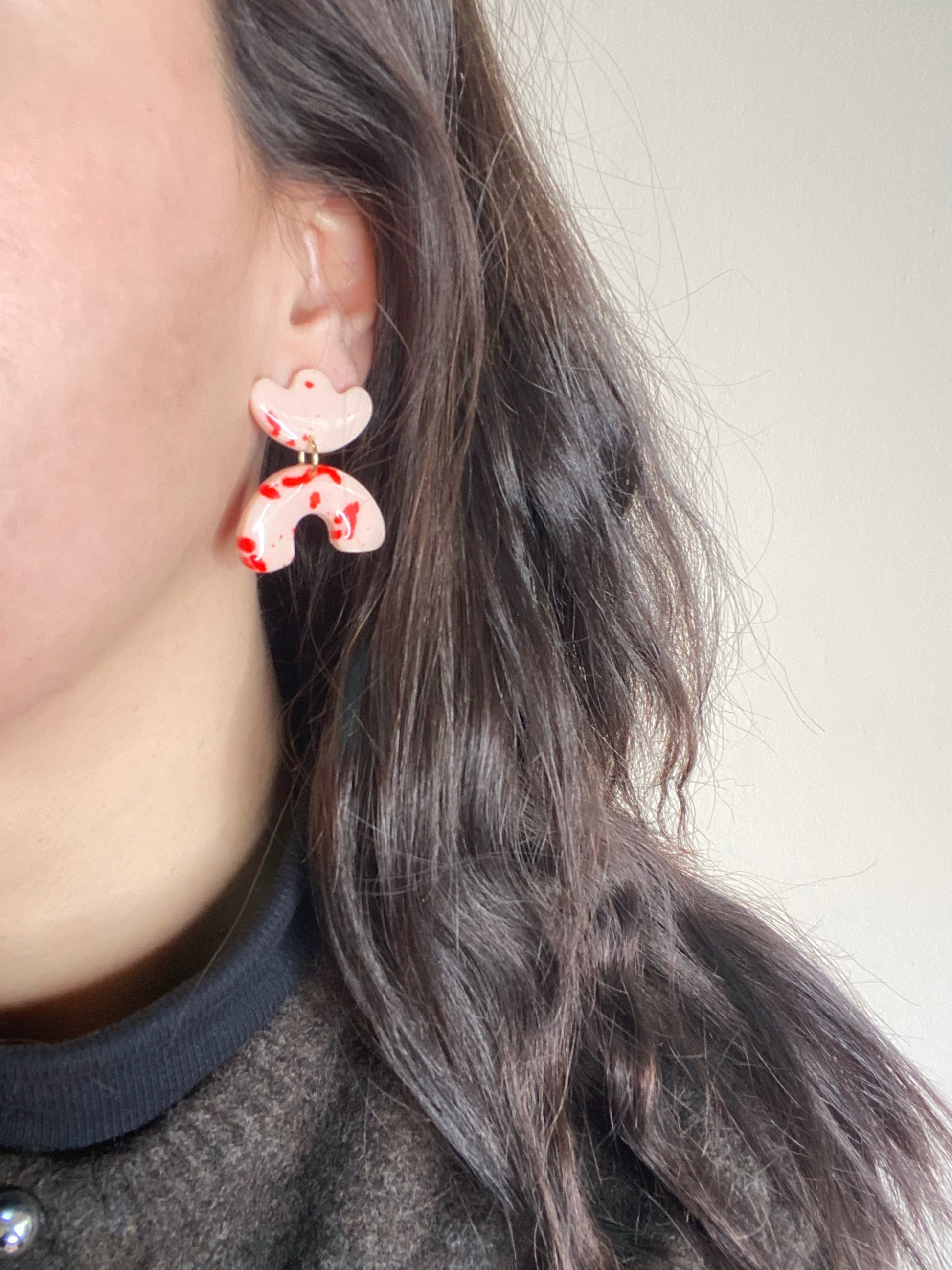 Αναδείξτε τη θηλυκότητα και τη φωτεινότητα σας με τα σκουλαρίκια Liora. Κατασκευασμένα από πολυμερικό πηλό, σε απαλό ροζ χρώμα με διακριτικές κόκκινες πιτσιλιές, έχουν αφηρημένο, οργανικό σχήμα που κινείται ελεύθερα πάνω και κάτω, προσφέροντας μια αίσθηση αιθέριας χάρης και παιχνιδιάρικης κομψότητας. Ιδανικά για όσες θέλουν ένα κόσμημα που συνδυάζει απλότητα, χρώμα και μοναδικότητα.